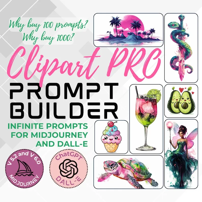 Clipart prompt builder PRO Midjourney prompt DALL-E 3 Clipart cute kawaii prompt Midjourney v6 ChatGPT prompt for Dalle 3 prompt clipart
