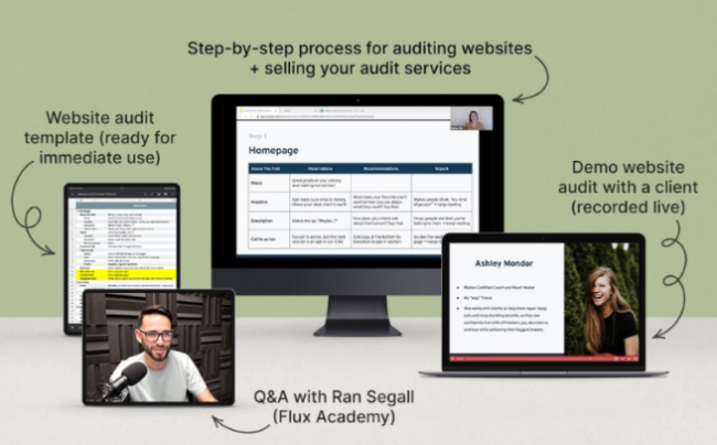 Most of us learn best through real examples, so I’m going to show you one. I’m bringing my friend and client, Ashley Mondor, so you can see a real, unrehearsed demo of a website audit delivery call during the masterclass.