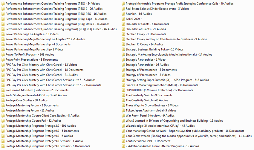 The Hard Drive 1 is a Mammoth – Monster – Outrageously Unparalleled 130+ Gigabyte collection of my most expensive, important (and legendary) 3-Day, 4-Day, 5-Day live training programs. Dozens of $5,000, $15,000, and $25,000 programs (on audio and video) have totally transformed business lives and fortunes on 5 continents.